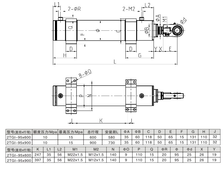 二級(jí)伸縮液壓缸 腳座連接外形安裝尺寸圖